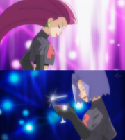In the 14th season (Black and White), they received a promotion to avant-garde agents later on they brand a contribution to disbanding Team Galactic by helping Detective Looker sneak into Team Galactic headquarters at Mount Coronet. However they took all the credit to their boss, lying well-nigh single-handed defeat of Team Galactic and Pokémon Hunter J, and they no longer serve as comic relief at all and have go more of a serious enemy. With their promotion, they received the official Team Rocket Grunt charcoal grey uniforms, only they later changed back into to their original, white uniforms in Battling for the Dear of Bug-Types! when they went dorsum to planning their ain schemes. In All-time Wishes! Season 1, they didn't "nail off" at all and virtually of the time they chop-chop retreated when they failed to capture Pikachu or any other Pokémon they accept planned to steal by escaping in air via para glider or jetpacks, but afterward they returned in Flavour 3 episode 11, they started "blasting off" again in a more than comical way. The trio have gained impressive athletic, hacking and infiltration abilities since arriving in their promotion and accept made capturing Pikachu less of a concern, instead focusing on major Team Rocket plans that will ultimately lead to conquest of Unova and the unabridged planet such as Operation Tempest. Although in Unova Survival Crisis! Giovanni was possessed past the Reveal Glass after Pikachu destroys the platform they are standing by using a huge and amplified Electro Brawl to rescue Meloetta in which he changes his programme from destroying Unova instead of conquering it. James, Jessie and Meowth eventually salve their boss by tackling him through the ground from his insane state rather than getting killed in the explosion which results them getting retreat immediately subsequently their programme is thrwarted. Later after Giovanni regains control of himself and thinking about what happened to him when he was possessed past the Reveal Glass, he directly orders to make a total retreat back to Kanto.